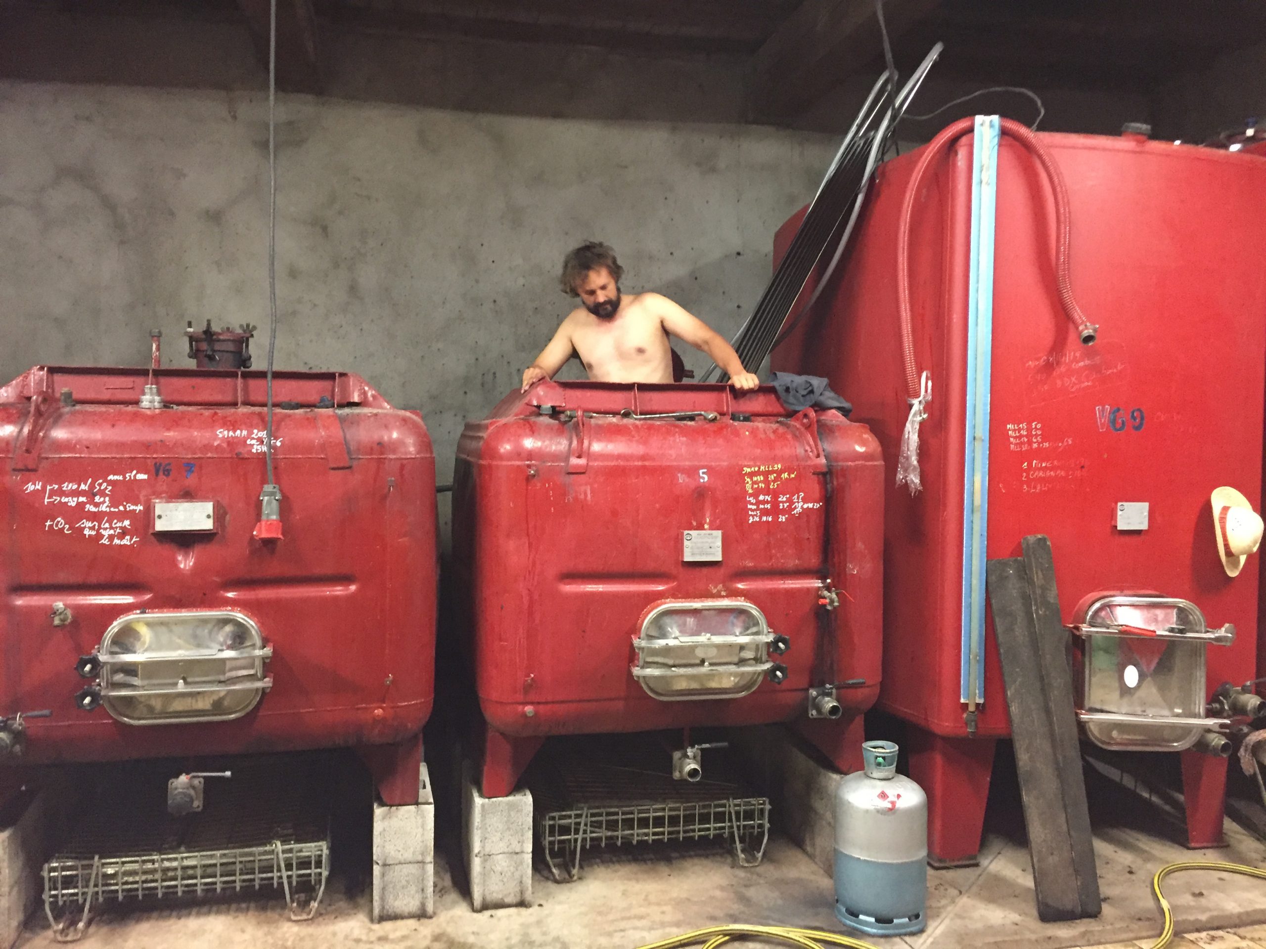Les raisins sont ramassés pour moitié à la main, puis égrappés avant d’être vinifiés dans des cuves de divers contenant (de 10hl à 140hl) et de divers matériaux, (polyester, acier émaillé, inox ou encore béton). Une partie de ces cuves permettent une pratique aujourd’hui de plus en plus délaissée, le pigeage, pratique qui consiste à mélanger en douceur le chapeau de raisins qui ce cré sur le jus en fermentation afin d’en extraire les meilleurs arômes sans en extraire les mauvais tanins.
